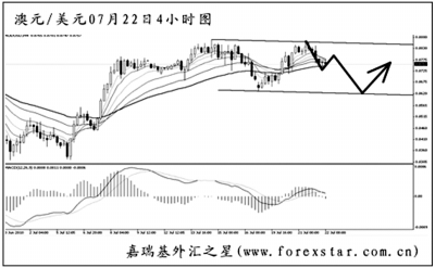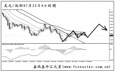 ▲美元兌瑞郎4小時(shí)圖此前發(fā)生了一連串的MACD底背離信號(hào)。匯價(jià)本周將包含背離點(diǎn)的下降趨勢(shì)線升破,此后一直在進(jìn)行調(diào)整。圖中所標(biāo)注的后市沖高目標(biāo)為道氏理論顯著高點(diǎn)阻力1.0675,預(yù)計(jì)匯價(jià)調(diào)整結(jié)束將向此位置發(fā)起沖擊,然后再度遇阻回落震蕩。