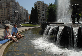 受內地大陸性氣候影響,西班牙大部分地區(qū)夏季日照時間長,氣候炎熱,有時氣溫高達38攝氏度。為防暑降溫,西班牙許多公共場所安裝了類似溫室里的一種噴霧裝置,為酷熱盛夏里的人們帶來一份舒適和愜意。 這種裝置分電風扇噴霧和管道噴霧兩款,在首都馬德里的地鐵站、露天餐館、酒吧和街道上都能看到。馬德里北部桑切斯·羅梅羅商業(yè)中心有一家西班牙地方特色菜餐館。餐廳分室內和室外兩部分,室內有空調,室外的露天平臺上就安裝著噴霧降溫裝置。 數百平方米的二層露天平臺上擺放了約50張餐桌,餐桌上方約兩米高的地方平行安裝了三行像細水管一樣的裝置,水管上每隔十余厘米就有一個小孔,每隔幾分鐘就從中噴出霧氣,有時略帶一些小水珠。霧氣能噴到一米多遠的地方,覆蓋了整個露天餐廳。西班牙的自來水可直接飲用,所以用餐者不會在意噴出的霧水落在餐桌或身上,而是感到一種“由天而降”的涼爽和愜意。 馬德里市中心美術館樓下的露天咖啡廳也有同樣的裝置。幾個涼棚、一些小桌,人們坐在那里邊聊邊品咖啡,時而從上噴下的霧氣,不知不覺已融入街邊的風景。 在市中心一條行人較多的街道上,路邊也安裝了一條200多米長的噴霧管道,不時噴出的霧水給過往行人帶來了意外的驚喜和涼意。 西班牙還有一種帶噴霧的電風扇,與落地電風扇類似,但更高更大。這種噴霧電風扇高約兩米,風扇直徑約60厘米,風扇中央有一個旅行杯大小的塑料小水桶,里面裝著水,打開風扇開關就可吹風和噴霧。 馬德里“美洲大道”地下中轉站安裝的就是這種降溫裝置。這是一個地鐵、市內公交和長途汽車地下中轉站,由于空間大,又與地面相通,因此無法安裝空調。安裝噴霧電風扇同樣起到了降溫作用,讓人感到涼爽舒適。 為順利度過夏季,西班牙政府還重視植樹和鋪設草坪,同時使用較細的噴水管澆灌。水霧慢慢噴在植物上,既灌溉又降溫,還節(jié)約用水。