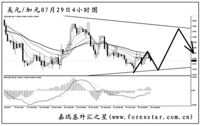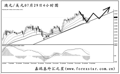 ▲澳元兌美元沿上升趨勢(shì)線走強(qiáng),中間雖然發(fā)生過(guò)較為明顯的下調(diào),但漲勢(shì)都沒(méi)有遭到破壞。圖中出現(xiàn)了MACD底背離信號(hào),同時(shí)匯價(jià)再度下探趨勢(shì)線,現(xiàn)在考驗(yàn)其支撐力度。預(yù)計(jì)澳元直接跌破此線的希望不大,且上漲空間廣闊,后市仍將以沖高走勢(shì)為主。