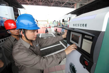 8月10日,在湖北襄樊市鄧城電動汽車充電站,工作人員準備為電動大客車充電。