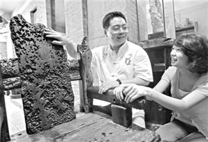 張有峰(左)正對著一塊老船木與讀者探討設(shè)計方案