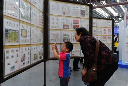 | 集郵是老少咸宜的收藏活動,祖孫倆在觀看集郵展。新華社