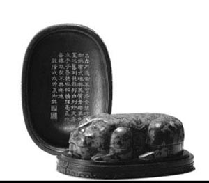 今年6月,在北京保利5周年春拍古董珍玩專場上,清乾隆“乾隆御用”御題詩澄泥伏虎硯及紫檀蓋盒以1400萬元成交,打破硯臺拍賣世界紀錄。今年5月,在中國嘉德2010春拍“翦淞閣——文房清供”專場上,清康熙御制松花石龍馬硯以425.6萬元高價成交,同樣引人注目。