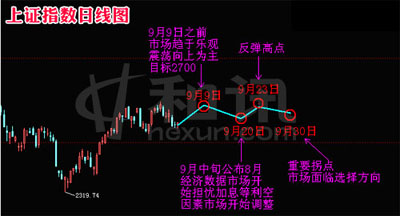 點。中國經(jīng)濟(jì)長期向好毋庸置疑,在此溫和通脹的宏觀背景下,股市中期仍然將會保持振蕩上漲格局,就9月份而言,銀行、地產(chǎn)、有色、鋼鐵、石化、航空航運(yùn)、煤炭采掘等行業(yè)總體處于較低估值水平,向下空間的相對有限,也封殺了大盤下跌空間。 因此總體上,9月將呈震蕩向上格局,月初9月9日拐點之前偏于樂觀,2700點仍可見到。而后,因為9月中旬8月宏觀經(jīng)濟(jì)數(shù)據(jù)出爐,通脹等因數(shù)將令市場重新?lián)鷳n央行加息提準(zhǔn)等利空因素,如果這種擔(dān)憂引發(fā)調(diào)整,那么調(diào)整或?qū)⒊掷m(xù)至9月20日時間窗口。隨后市場反彈至23日見高點后,調(diào)整至30日。因為十一長假即將來臨,周邊市場不確定加大,月底30日將是一個成交低迷期,市場面臨重新的方向性選擇。