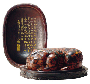 在今年6月北京保利5周年春拍之前,硯臺一度不被過多地關(guān)注。保利春拍,一方硯臺以1400萬元成交,打破了硯臺拍賣的世界紀(jì)錄。硯臺,以石破天驚的氣勢強(qiáng)勢登陸了藏家的眼球。 這款被拍出天價的硯臺,是清乾隆“乾隆御用”御題詩澄泥伏虎硯及紫檀蓋盒。此硯在《欽定四庫全書》、《欽定西清硯譜》等皇家典籍中均有著錄。此硯整器作臥虎之形,色屬澄泥硯中最為上乘的鱔魚黃,乃吳中供御巧匠根據(jù)絳州澄泥配方重新創(chuàng)造之品。該伏虎硯以一橢圓形包袱式紫檀木盒儲之,盒面鐫刻隸書“虎伏研”三字,盒蓋內(nèi)填金隸書御銘與硯銘相同,下有鈐寶二,曰“會心不遠(yuǎn)”、“德充符”。盒內(nèi)底鐫刻隸書“乾隆御用”并“幾暇臨池”方印,均填金,雕飾十分精美,應(yīng)為乾隆書房中蒙皇帝手澤的珍品。
