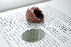 也許年少的時(shí)候你也折過紙戒指,不過今天看到的紙戒指,跟當(dāng)年你的那枚真是很不同。Jeremy May從書本中挖出一部分,用獨(dú)特的壓制方法把上百頁的紙張壓到一起,雕刻成形狀獨(dú)特的戒指,再細(xì)心打磨出光澤,最后的最后,把成品的戒指再放回書本切出的空間里。書頁上的文字會在戒指上若隱若現(xiàn),選一本有寓意的書本來制作這么一枚有心意的紙戒指,應(yīng)該很浪漫吧?
