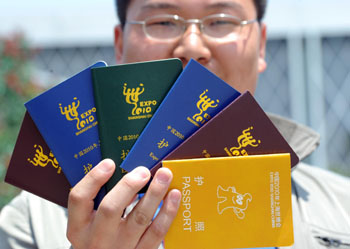 作為此場拍賣的1號拍品,由上海東沃文化傳媒有限公司提供的老版“000000001號”世博護照成為全場關(guān)注的焦點。這套護照由瑪瑙紅、寶石藍、橄欖綠、卡通版4本組成,除了蓋有各世博場館的印章外,眾多場館總代表或館長的親筆簽名和對世博的祝福語令這件拍品顯得彌足珍貴。
