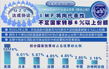本屆G20財(cái)長(zhǎng)和央行行長(zhǎng)會(huì)議就發(fā)展中國(guó)家提升在IMF中的地位達(dá)成里程碑式協(xié)議。協(xié)議同意歐盟將向發(fā)展中國(guó)家轉(zhuǎn)讓2個(gè)席位和6%以上的投票權(quán),IMF董事會(huì)目前共有24個(gè)席位。該組織執(zhí)行主席卡恩稱此舉為“歷史性”時(shí)刻。