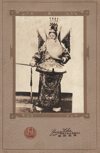 而出現(xiàn)在2008年華辰影像拍場(chǎng)的1219號(hào)拍品是這個(gè)影像的原版老照片,它表明了該照片是北京源記照相館所攝,而非出自泰豐照相館。隨后陸續(xù)面市的數(shù)張?jiān)撚跋竦脑胬险掌,全部來自源記?紤]到源記是泰豐的競爭對(duì)手,拷貝泰豐的可能性不大,基本可以判斷這張照片不是1905年豐泰拍攝中國第一部電影《定軍山》時(shí)的劇照,而是源記拍攝的譚鑫培《定軍山》戲裝照,這個(gè)例證將可能改寫中國攝影史、中國電影史和中國京劇史相關(guān)內(nèi)容。