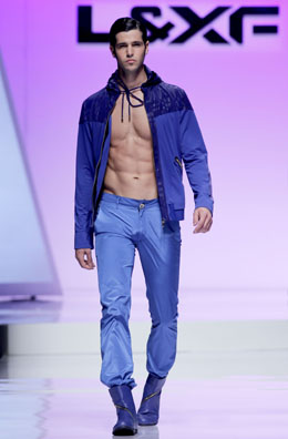 男裝品牌L&XF以“激情誘惑”“時(shí)空浪漫”兩個(gè)系列詮釋了“未來(lái)主義”的主題!凹で檎T惑”展示了大面積藍(lán)色與紅色的搭配;“時(shí)空浪漫”中,高貴神秘的紫色、輕盈活力的果綠色等一系列明亮的色彩被創(chuàng)意組合“以往男裝總是給人色彩暗淡、線條呆板的印象,要打破男裝設(shè)計(jì)的單一化,就得進(jìn)行大膽創(chuàng)新,比如藍(lán)色、紅色等明亮色彩就能夠搭配出視覺沖擊力,讓男人更加時(shí)髦而富有運(yùn)動(dòng)感!盠&XF設(shè)計(jì)師劉小飛向記者表達(dá)了這樣的觀點(diǎn)。