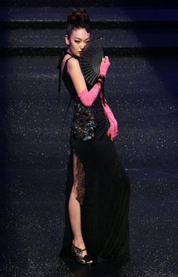 伴隨古韻的音樂(lè),設(shè)計(jì)師鄧皓以世博會(huì)中國(guó)館為靈感,充分結(jié)合中國(guó)傳統(tǒng)古建筑結(jié)構(gòu)和圖案,上演了一幕大氣的“中國(guó)紅”。整場(chǎng)走秀,所有模特全部盤著高高的古典發(fā)髻,妝面雍容典雅,身穿設(shè)計(jì)師精心打造的中國(guó)紅,恰到好處地詮釋了中國(guó)文化的東方美。