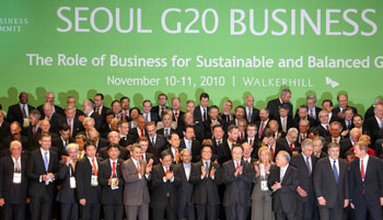 11月11日,出席首爾G20商務(wù)峰會的各國代表在會場合影留念。新華社發(fā) |