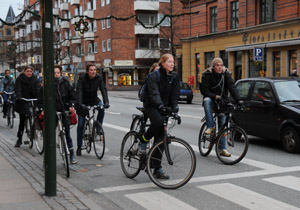 在丹麥首都哥本哈根,人們在自行車專用車道上等待通行。 |