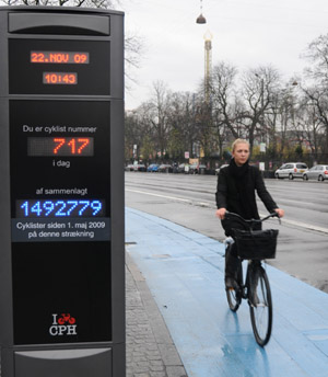 在丹麥首都哥本哈根,一名女子騎車經(jīng)過馬路旁的自行車流量顯示裝置。這個裝置自動記錄通過這里的自行車數(shù)量。本版照片均由本報記者