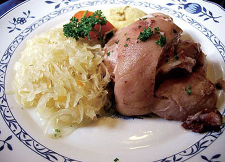 德國人愛吃豬肉,據(jù)說每人每年平均吃掉66公斤豬肉。所以,在菜單上最常見到也是跟豬有關(guān)的菜。比較有當(dāng)?shù)靥厣挠蠩isbein,就是豬蹄,也有稱豬腳和豬手。Eisbein一般指的是煮,也有做法是烤,稱作Schweinshaxe,皮脆而不干,配酸菜,酸白菜的德文是Sauerkraut。從價(jià)格上來講,也是豬肉相對(duì)便宜,其次是牛肉,然后是魚。但是魚的話,建議不點(diǎn),總之不是特別好吃就是了。