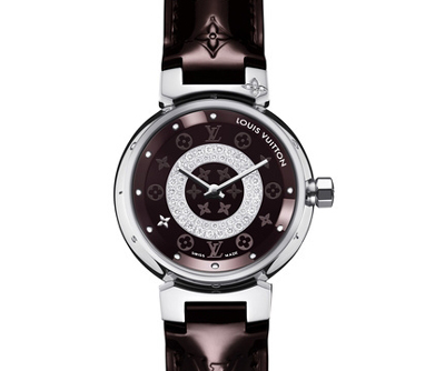 表殼直徑39.5毫米精鋼表殼,帶Monogram圖案的深紫紅色烤漆表盤表盤和表耳上鑲有白色的鉆石深紫紅色Monogram Vernis 皮質(zhì)表帶石英機芯