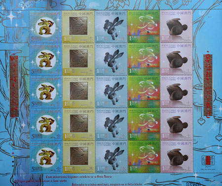 日前,兔年郵品新聞發(fā)布會在澳門特區(qū)政府郵政局舉行,據(jù)介紹,郵政局在1月5日發(fā)行2011年首套郵品,以兔年為主題,整套5枚郵票售價為11元,亦會推出首日封,小型張和郵票茶壺禮盒等,供市民選購。