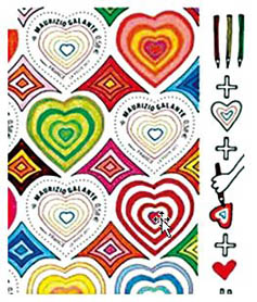 其中面值0.58歐元的郵票是自由上色郵票(圖1),主圖是5層心形,使用者可以根據(jù)自己的喜好給各層心形涂色,郵票左下的小圖案就是使用說明;面值0.95歐元的郵票上有一顆大紅心(圖2),這顆紅心是采用燙印技術印上的一層可以刮掉的膜,使用者可以用筆在上面刮劃出自己的名字或想說的簡短話語,左下小圖說明中紅心上的MG就是設計師姓名的縮寫。