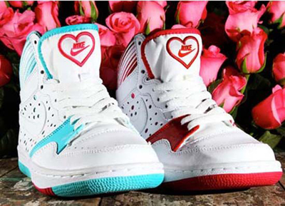 鞋舌上沒有用‘Amor’字樣而是采用一個非常可愛的Nike包裹著愛心圖案。白色為主的側(cè)邊鞋身上布滿了意大利式皮鞋那種不規(guī)則的穿孔,透出修飾用的紅色或者水綠色底色,整體給人的感覺非常清新活潑,CF
