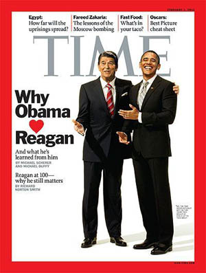 最新的177卷第5期的美國《時代周刊》雜志于2011年1月28日正式出刊,本期封面文章標題為“里根:奧巴馬的榜樣”。文章認為,里根與奧巴馬雖處在不同年代,分屬不同的政治陣營,但前者的政治智慧無疑或多或少在影響著后者的執(zhí)政思路。