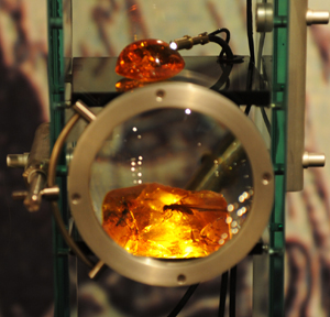 博物館里特別設(shè)置了放大鏡,可以讓參觀者清楚看到蟲珀里的昆蟲。我湊近細(xì)觀,蟲珀里面的昆蟲栩栩如生,好像活的一樣,有的還能清楚地看到它們腿上細(xì)小的毛發(fā)。這些均是數(shù)千萬年以前的原始生物,最常見的包裹物是蜘蛛,人們統(tǒng)計(jì)過,琥珀中的蜘蛛多達(dá)267種,其中大多是熱帶或亞熱帶的,有許多早已從地球上消失。端詳著來自幾千萬年前、栩栩如生的小動(dòng)物時(shí),不得不感慨自然的神奇,昆蟲的命運(yùn)最終被定格在這小小的琥珀中,留下永久的紀(jì)念。