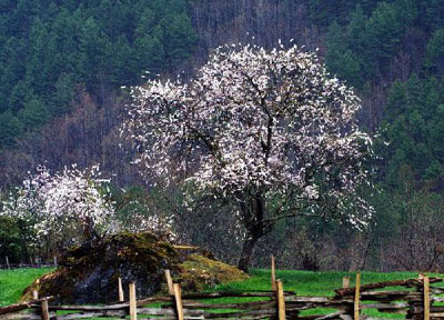位于林芝縣的嘎拉桃花村,也是賞桃花的最佳地點(diǎn)。一排排盛開的桃花在臺階式綠色麥田的襯托下,整個(gè)山坡如同藏族婦女的圍裙耀眼奪目。游客來到這仙境般的桃花村,不僅可以領(lǐng)略到藏族姑娘的熱情好客,還可以體會(huì)到勞動(dòng)的歡樂場面。