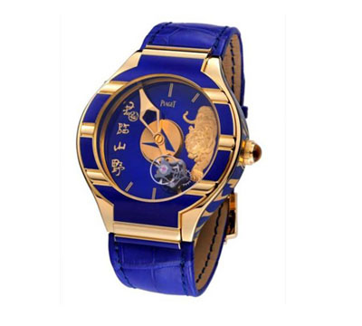 系列伯爵相對陀飛輪虎紋主題特殊訂制彩繪腕表,18K黃金材質(zhì)表殼,面盤以大明火燒制雕刻內(nèi)填琺瑯彩繪技術(shù)完成,608P手動上鏈陀飛輪機芯,動力儲存約70小時,飛行陀飛輪之分針中央軸心在表盤上,以每小時為單位運行一周,而陀飛輪框架則懸置于分針未端隨框架軸心以每分鐘為單位旋轉(zhuǎn)一周,機芯裝飾:日內(nèi)瓦波紋、主夾板圓形魚鱗紋打磨、表橋與陀飛輪框架以手工進行邊緣輪廓倒角處理及藍鋼螺絲,藍色鱷魚皮表帶,18黃金材質(zhì)折疊表扣,特殊訂制款式全球僅此1只,Ref.
