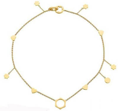 另一款18K黃金手鏈飾串上兩顆星形金飾及經(jīng)典鏤空星形環(huán),于兩枚心形金飾烘托下更覺俏麗;而18K黃金項鏈不但綴以鏤空星形環(huán),兩旁四顆星形金飾與四顆心形金飾相間排列和諧有致,金光妙曼躍動,如一闋華麗樂章。
