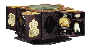 多寶格的設(shè)計(jì),琳瑯多樣,精巧無比,不論盒、匣、箱、柜,皆是一種妥善利用空間的工藝作品、以最有限的空間,存放最多的物品,在造型上,力求美觀精巧,所以往往一件多寶格,箱蓋中有盒、盒中有套匣、套匣中又有屜、隱隱約約、輾轉(zhuǎn)曲折,有時(shí)一個(gè)轉(zhuǎn)紐,便見門,門之后,另有一番天地。故多寶格體積雖小僅及尺許,而其所藏珍玩,每每多達(dá)數(shù)十,乃至百件,因此觀賞時(shí)常有尋尋覓覓、撲朔迷離的趣味。