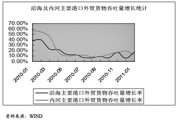 山西證券業(yè)提供了一組數(shù)據(jù)證明該板塊運(yùn)行業(yè)績比較平淡。據(jù)報告介紹:2011年1—2月份我國主要港口外貿(mào)貨物吞吐量完成4.33億噸,同比增長10.2%,較2011年1月增速回落3.3個百分點(diǎn),較2010年增速回落3.97個百分點(diǎn)。受2月份集裝箱吞吐量大幅下降拖累,2011年1—2月集裝箱吞吐量增速回落幅度較大,較2011年1月份增速回落4.20個百分點(diǎn),較2010年全年增速回落5.99個百分點(diǎn)。
