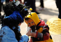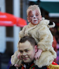在這場狂歡盛宴中,我注意到不少都是全家出動(dòng),大人孩子從頭到腳都打扮得非常般配,看著那些可愛的親子裝,一家人其樂融融的樣子,頗讓人羨慕。雖說孩子是“上帝派來索債的”,但孩子也是上帝的恩賜,尤其是在生育率持續(xù)走低的歐洲國家,一個(gè)家庭因?yàn)楹⒆拥牡絹矶鎏淼臉啡な侨魏问虑槎疾荒鼙葦M的。