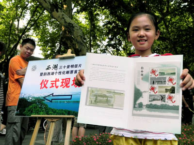日前,“西湖三十景”明信片暨“韻西湖個(gè)性化郵票”首發(fā)式在杭州西湖博物館舉行。為紀(jì)念杭州西湖申遺成功,杭州市郵票公司發(fā)行“西湖三十景”明信片和“韻西湖個(gè)性化郵票”郵折。明信片首次以油畫(huà)作品形式展現(xiàn)西湖三十景,并配有三十景示意地圖和西湖全景圖。明信片上有國(guó)家郵政局特批的“世界文化遺產(chǎn)”標(biāo)志郵資圖案,刻制了與西湖三十景相對(duì)應(yīng)的風(fēng)景紀(jì)念戳,吸引眾多市民前來(lái)購(gòu)買(mǎi)。