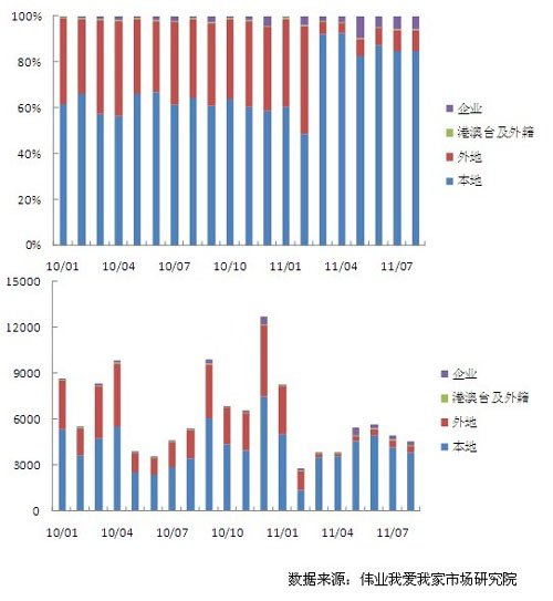 據(jù)偉業(yè)我愛(ài)我家市場(chǎng)研究院數(shù)據(jù)顯示,2010年1月至2011年1月(即2011年2月“限購(gòu)令”推出之前),北京一手住宅成交記錄中61.0%的購(gòu)房者為北京本地戶(hù)籍,不同月份在56%~67%之間波動(dòng),外地戶(hù)籍購(gòu)房者則占比36.9%,港澳臺(tái)及外籍人士占比0.4%,企業(yè)購(gòu)房占比為1.7%;2011年3月至8月,北京本地戶(hù)籍購(gòu)房者比重上升為86.9%,外地戶(hù)籍購(gòu)房者下降為7.4%,港澳臺(tái)及外籍人士占比0.3%,企業(yè)購(gòu)房占比升至5.3%。從量上看,2010年1月至2011年1月,北京一手住宅月均成交約7249套,其中北京本地戶(hù)籍購(gòu)房者4423套、外地戶(hù)籍購(gòu)房者2674套、港澳臺(tái)及外籍人士31套,企業(yè)購(gòu)房120套。2011年3月至8月,北京一手住宅月均成交約4728套,比之前減少34.8%,其中北京本地戶(hù)籍購(gòu)房者4111套,減少7.1%,外地戶(hù)籍購(gòu)房者352套,減少86.8%,港澳臺(tái)及外籍人士15套,減少53.2%,企業(yè)購(gòu)房250套,增長(zhǎng)107.9%。