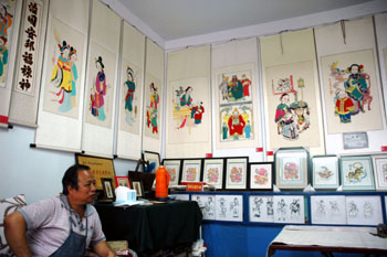 圖為在民間藝人吳百鎖的家里,到處掛滿了他制作和收藏的絳州木版年畫。 |