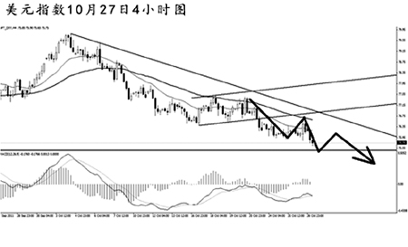 美元指數(shù)通過(guò)前期的旗形下跌中繼整理,繼續(xù)選擇下行突破。隨即對(duì)旗形下沿發(fā)生回抽,在均線系統(tǒng)的壓制下再度創(chuàng)出新低。目前美元指數(shù)的下跌趨勢(shì)已經(jīng)形成,圖中的下降壓力線始終未能被突破。從日線圖上看,76.00一線的支撐被跌破后,下方的下跌空間廣闊,預(yù)計(jì)美元指數(shù)調(diào)整過(guò)后將繼續(xù)以下行為主。
