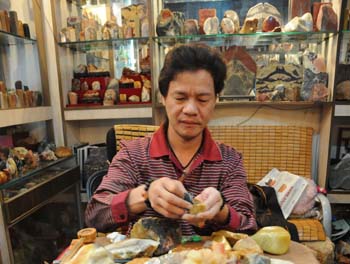 福州左海藝術(shù)村一家壽山石店的店主在用細砂紙打磨原石,他經(jīng)常購進大批原石,經(jīng)簡單加工后出售就能賺取高額利潤。記者 來建強/攝 |
