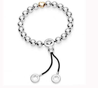 萬寶龍情人節(jié)銀珠手鏈以黑線串起一顆顆亮澤銀珠,之中獨有一顆玫瑰金心形綴飾,造型優(yōu)雅婉約,造工考究,無須多言亦顯出男方對女方的綿綿愛意;女方佩戴腕上,彷如對方的心意如影隨形,時刻感動,更不失時尚腕飾之妙。