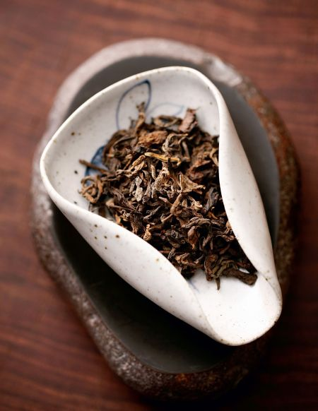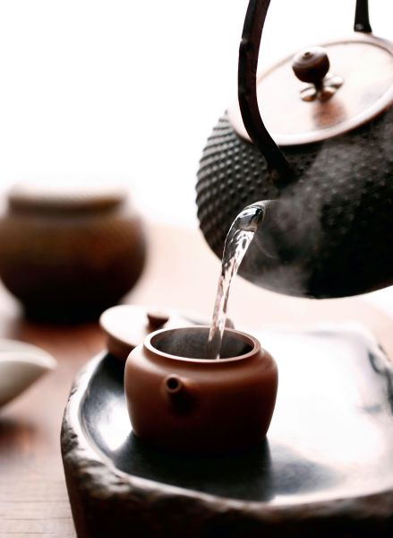 石質(zhì)的茶托質(zhì)樸沉穩(wěn),一切搭配得都與季節(jié)相仿,溫潤(rùn)的紫砂壺被填入茶葉,放在同為石質(zhì)的茶海上,與瓷器茶壺相比,滋養(yǎng)許久的紫砂壺不僅能更好地蘊(yùn)藏香味使之慢慢散發(fā),細(xì)密的氣孔更能過(guò)濾普洱的些許澀味,讓茶水的潤(rùn)滑口感格外明顯,泡出醇厚的滋味。敞口的杯子一一放在我們面前,一旁日本南部鑄鐵壺里的水已經(jīng)發(fā)出沙沙的聲響,古人講究茶道,對(duì)水也挑剔,用鐵壺可以讓煮出的水有很軟的口感,并能提高和保存水的溫度,讓水變得甘甜、順滑,口感也更為飽滿,用來(lái)泡茶,是錦上添花,能激發(fā)普洱的內(nèi)質(zhì)陳香和茶韻,溶在水中的鐵質(zhì),也有利于身體健康。一切都已準(zhǔn)備妥當(dāng),聽著漸漸沸起的水聲,我們期待這一泡好茶的沖開。