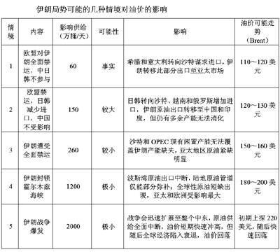 此外,對于伊朗局勢可能的幾種情境,我們做出以下歸類(見下表)。其中情境1、2和3之間的跨度較大,而在情境3下,伊朗遭受全面制裁后到情境4和5的演變將會較為迅速。一旦伊朗爆發(fā)戰(zhàn)事,將會引發(fā)中東原油生產(chǎn)的全面停滯。從目前事態(tài)的發(fā)展來看,仍處于情境1的預(yù)期之下,我們預(yù)計在7月歐洲正式對伊朗實施禁運(yùn)之后,有可能發(fā)展為情境2,而發(fā)展至情境3的可能性極小。因此,就伊朗局勢的影響而言,我們預(yù)計,在一季度、二季度偏中性,而在三季度之后將對油價產(chǎn)生一定推動。