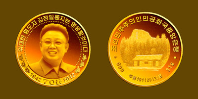 朝鮮最高人民會議常任委員會近日發(fā)布政令,宣布發(fā)行金正日誕辰70周年紀念幣。據(jù)朝鮮媒體報道,紀念幣分為金幣和銀幣。紀念幣正面中央為金正日像,外環(huán)為70個點,上外環(huán)和下外環(huán)分別有“偉大領(lǐng)導(dǎo)者金正日同志永垂不朽”和“1942,70周年,2012”字樣,兩旁各有3朵木蘭花;紀念幣背面中央為以正日峰為背景的白頭山密營故居,左右兩旁標有紀念幣純度和重量,上外環(huán)有“朝鮮民主主義人民共和國中央銀行”字樣,下外環(huán)標有發(fā)行年度。