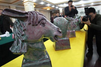 日前,中國鈞瓷十二獸首新聞發(fā)布暨作品研討會在河南許昌市舉行。據悉,中國鈞瓷十二獸首鐫刻圓明園標志,經圓明園管理處授權制作、監(jiān)制,限量制作151套,編號從1860到2011,紀念自1860年英法聯軍火燒圓明園到2011年的151年歷史。編號1860的作品由圓明園管理處永久收藏。 圖為中國鈞瓷十二獸首在河南許昌迎賓館亮相。新華社發(fā)