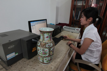 工作人員在用脫玻化結(jié)構(gòu)分析法對瓷器的年代進(jìn)行數(shù)據(jù)分析!懊摬;蓖ㄟ^對瓷器釉面微觀物質(zhì)結(jié)構(gòu)的測試可以確定釉質(zhì)結(jié)構(gòu)變化的程度、推測釉質(zhì)最后燒成的年代,以此來判斷器物的年代。記者