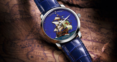 Nardin(雅典表)的Classico「圣瑪利亞號(hào)」鎏金限量腕表以這艘尊貴船艦及其冒險(xiǎn)故事為創(chuàng)作題材。選用傳統(tǒng)和珍貴的掐絲琺瑯工藝,配合細(xì)致的琺瑯?biāo)囆g(shù),透過這款表頌揚(yáng)「圣瑪利亞號(hào)」的英勇無懼。雅典匠師運(yùn)用鮮艷的色彩,按照嚴(yán)格的規(guī)格,精心雕琢每一個(gè)細(xì)節(jié)。在深藍(lán)色的天空襯托下,《圣瑪利亞號(hào)》豎起桅桿和帆,在桅桿頂部的旗幟隨風(fēng)飄揚(yáng),藍(lán)綠色的海濺起浪花撲向木制船身,盡顯其雄偉與壯觀。
