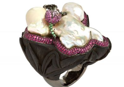 花朵戒指:18ct白金戒指,寶石與珍珠完美結(jié)合的典范,石榴紅色的寶石搭配綠色寶石惟妙惟肖地體現(xiàn)出了花朵的造型。