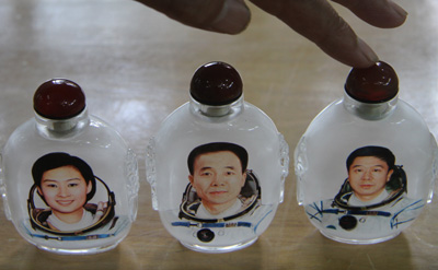 近日,中國工藝美術(shù)大師張汝財運(yùn)用傳統(tǒng)的內(nèi)畫藝術(shù)繪制了以神舟九號任務(wù)飛行乘組三位航天員為主題的內(nèi)畫作品。據(jù)悉,該肖像水晶球內(nèi)畫,將贈送中國航天城永久展覽,3件內(nèi)畫鼻煙壺將分別贈送給神舟九號任務(wù)飛行乘組三位航天員景海鵬、劉旺、劉洋收藏。