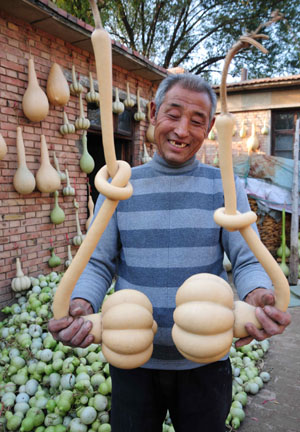 近年來,河北省廊坊市大城縣臧屯鄉(xiāng)九間房村大力發(fā)展工藝葫蘆種植產(chǎn)業(yè),通過對(duì)葫蘆生長(zhǎng)過程進(jìn)行人工控制,選擇適當(dāng)時(shí)機(jī),軟化葫蘆、做出不同造型。工藝葫蘆成品具有很高的觀賞、收藏價(jià)值,每年都會(huì)吸引眾多來自北京、天津、上海等地的收藏家前來收購(gòu)。目前,全村工藝葫蘆種植面積達(dá)100多畝,年純收入達(dá)150多萬元。