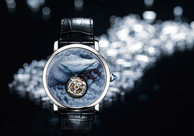 Cartier(卡地亞)傾注無比熱情,大膽地將微妙的浮雕技術(shù)運用于制表藝術(shù)打造這款腕表。天然瑪瑙微妙的漸變藍(lán)色不禁令人想起大海,一條惟妙惟肖的鱷魚在寶石切割師的鬼斧神工下從海浪中浮現(xiàn)出來。