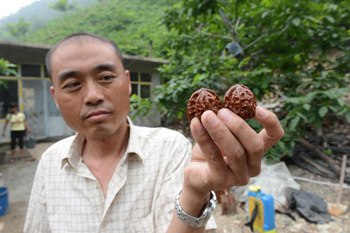 在河北省承德市興隆縣青松嶺鎮(zhèn)螞蟻溝村,一位農(nóng)民正在展示一對(duì)已經(jīng)把玩了3年的麻核桃。記者 王民/攝 |