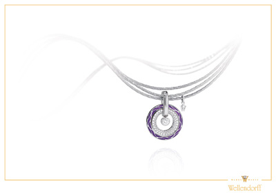 魔幻紫晶護身符吊墜 Wellendorff全新魔幻紫晶系列護身符吊墜迷人而嫵媚,不僅因為它充滿魅惑的色彩,同時也因為它的9種不同佩戴方式。魔幻紫晶護身符吊墜的外環(huán)由神秘的紫色與至純的18k白金相互輝映,構(gòu)成Wellendorff經(jīng)典風(fēng)格的抽象羽翼,同時,也為中心的單顆鉆石和整環(huán)鑲鉆的內(nèi)環(huán)增加了現(xiàn)代時尚的氣息。中心的獨立鉆石與整環(huán)鑲鉆的內(nèi)環(huán)都懸掛于一個精致的珠寶彈簧卡夾之上。謹小慎微又精細別致的Wellendorff金匠藝術(shù)可以在其精確加工的閉合機制中得以窺見:即便是在打開的時候,依舊可以安全可靠地保證圈環(huán)的位置而不會掉落。