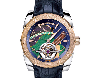 Samba Madeira腕表的稱頌對象是巴西,因此吉他的背景圖案也如巴西國旗一般:巴西的國家箴言“秩序與進(jìn)步”(Ordem e